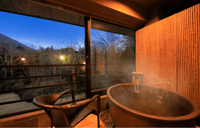 室内にありながらも、大きな窓から景色を楽しめる「半露天風呂」の施設もございます。開放的な気分を味わいながら、室内にいるため天候に左右されません。また、寒さが苦手なお客様にもおすすめです。露天風呂の開放的な雰囲気と天候に左右されない利便性の良いとこ取りの露天風呂です。